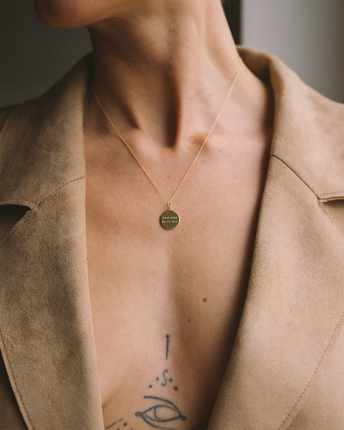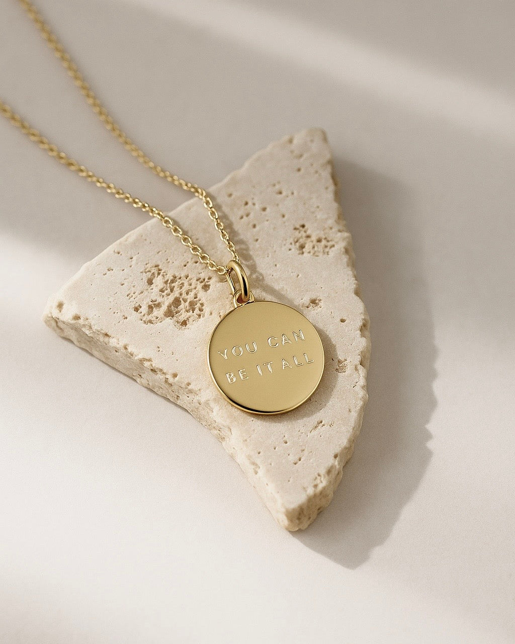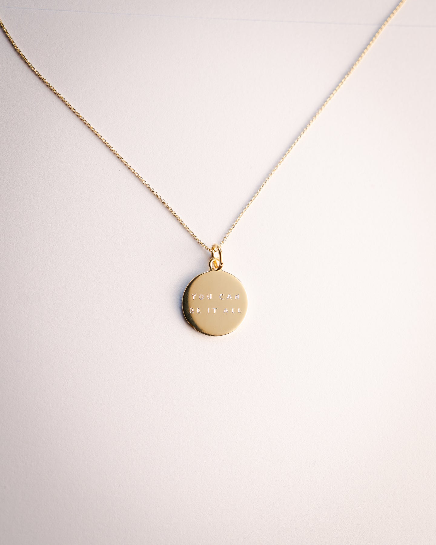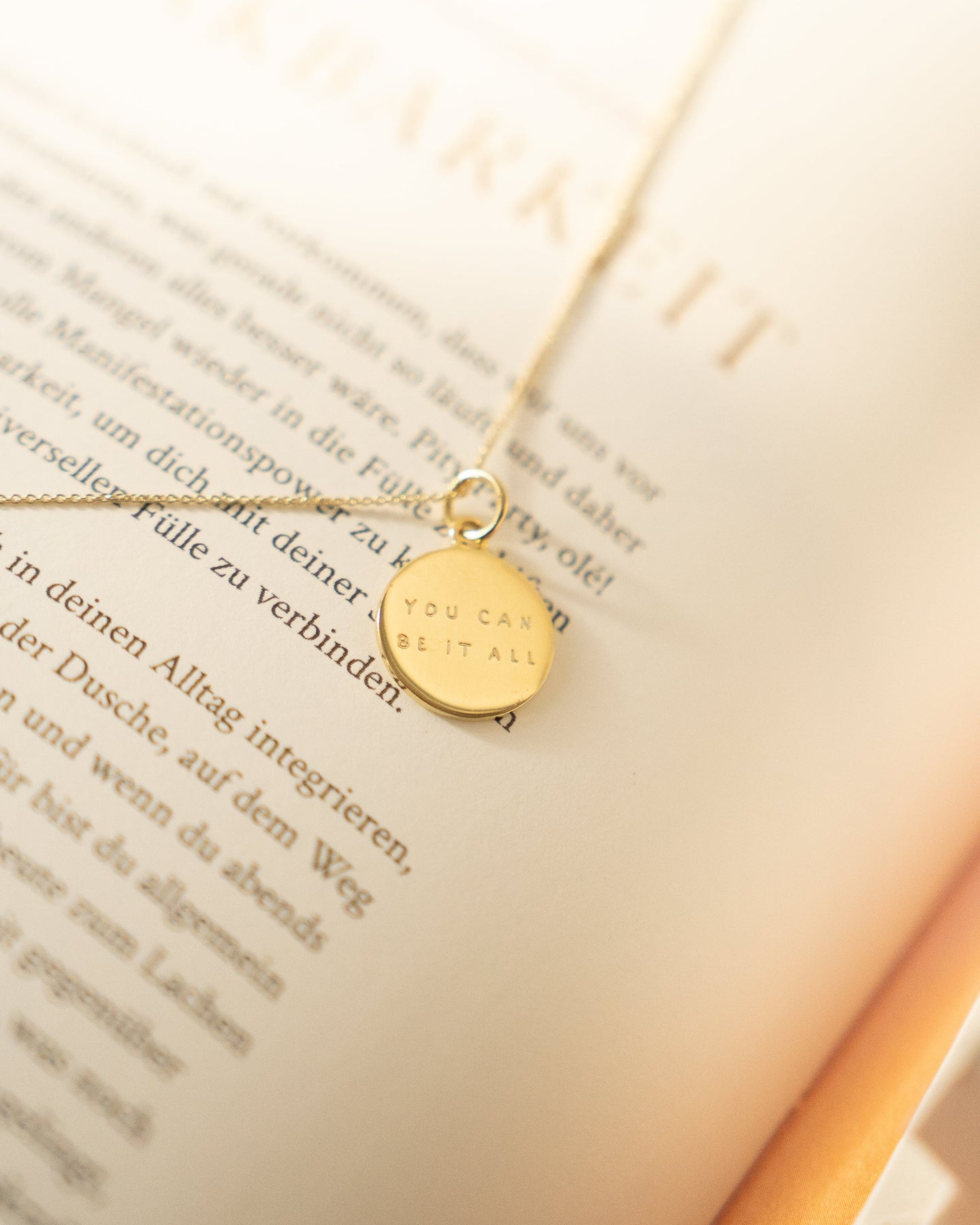 Anhänger: rundes Plättchen mit Icon Gravur auf der einen Seite und den Worten "You can be it all" auf der anderen (Durchmesser: 13mm)