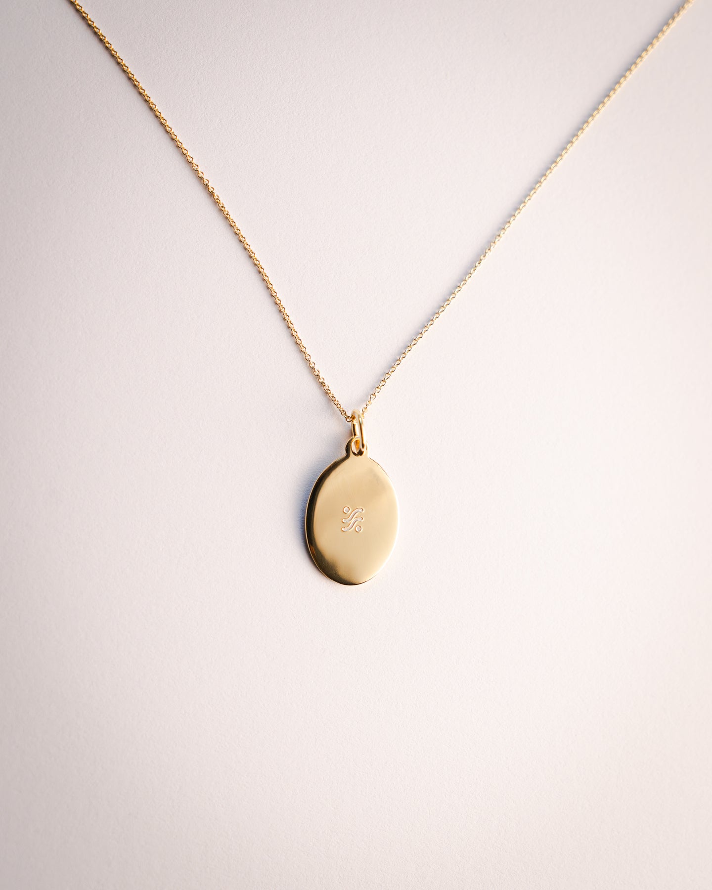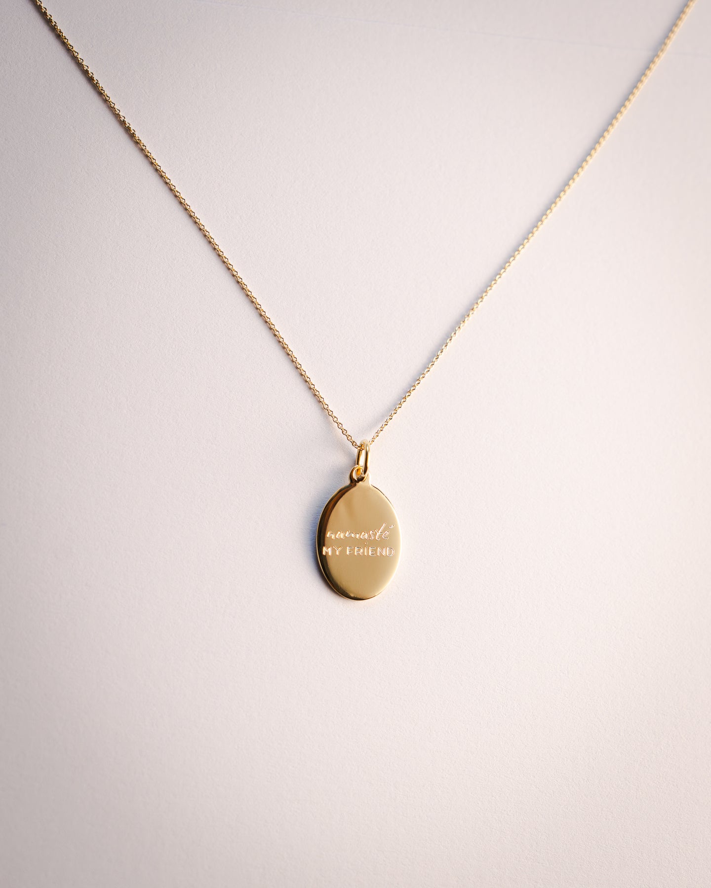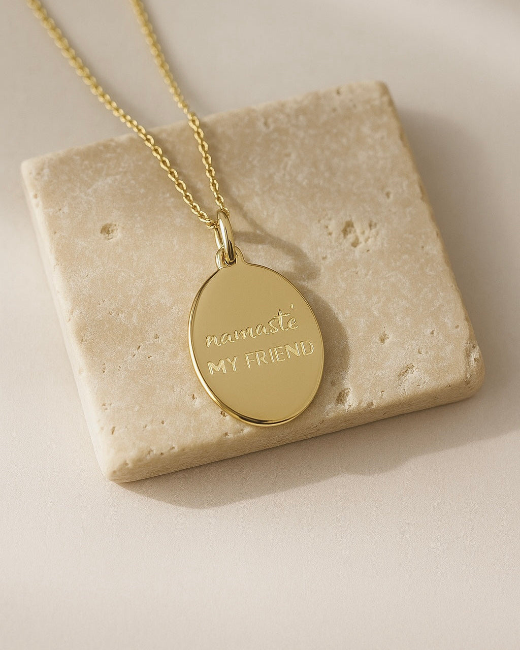 Anhänger: ovales Plättchen mit Icon Gravur auf der einen Seite und den Worten "Namasté my friend" auf der anderen (11mm x 14mm)