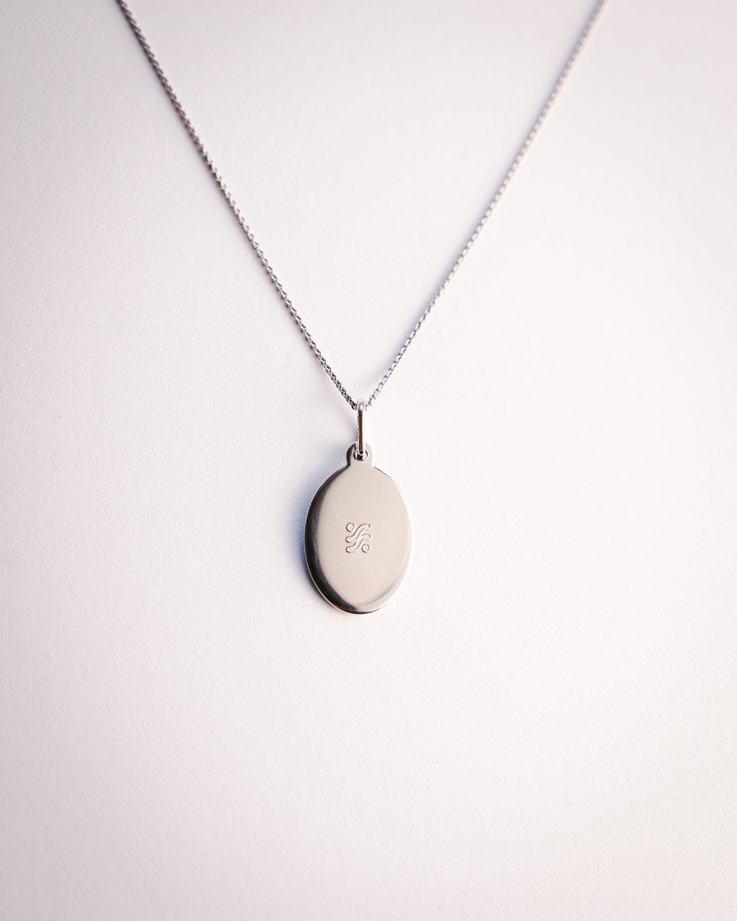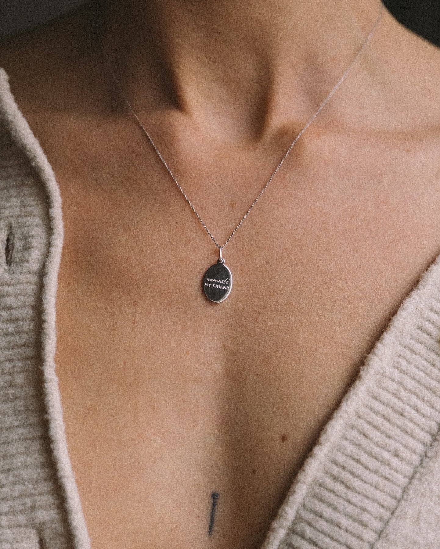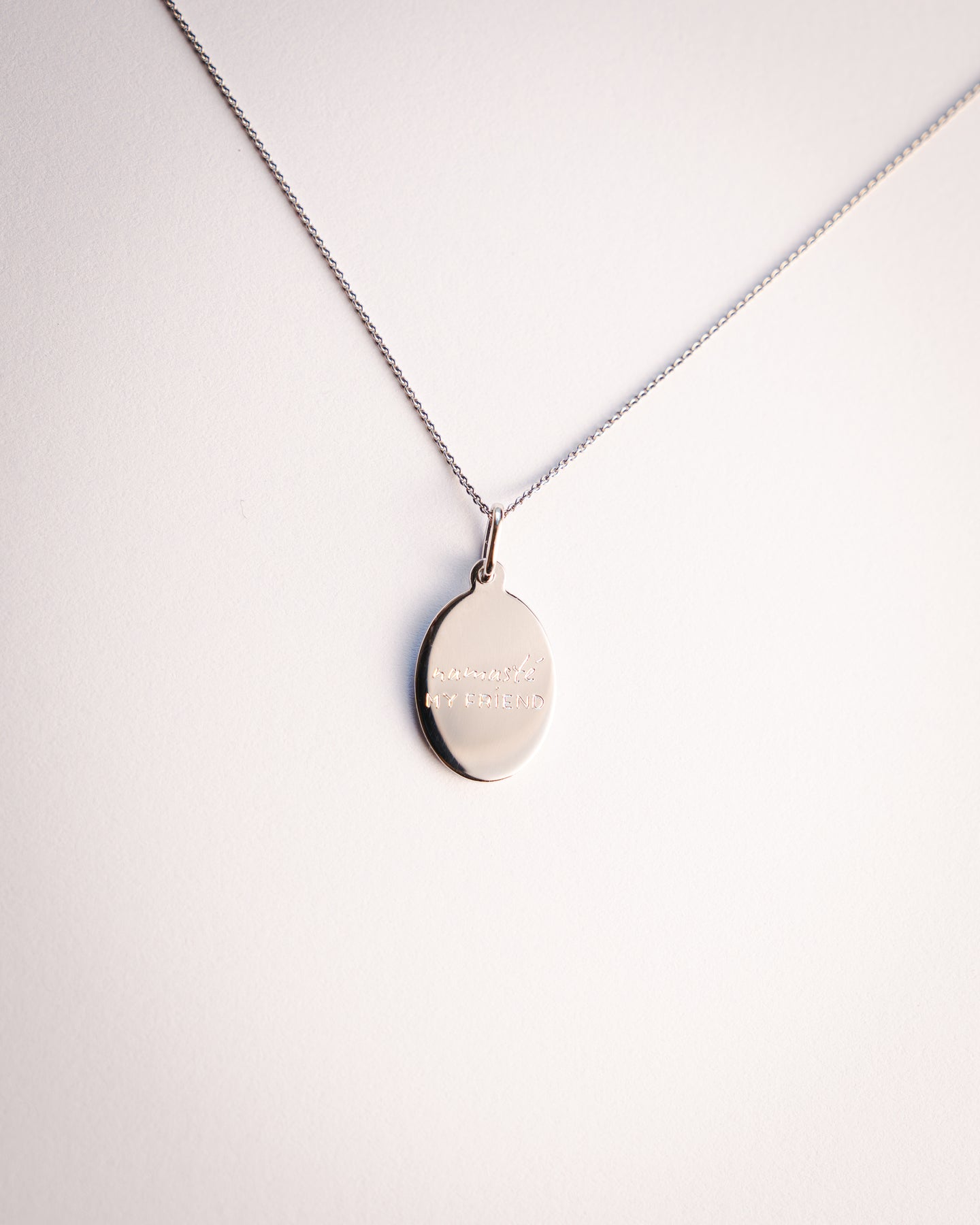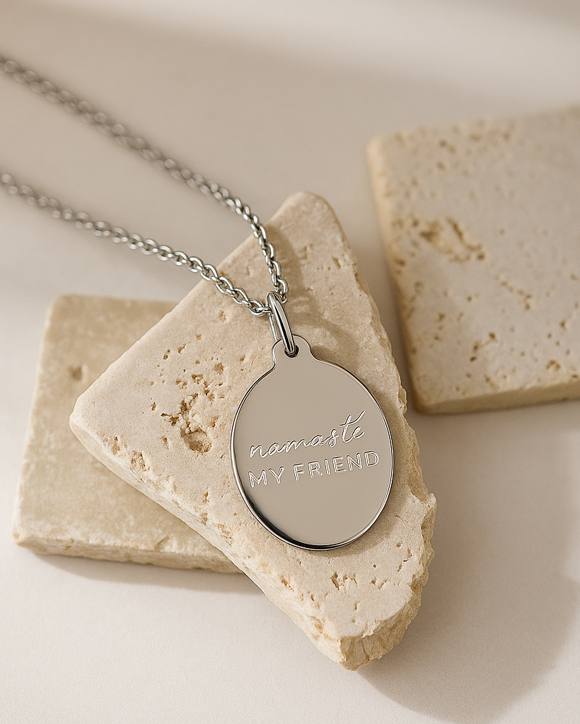 Anhänger: ovales Plättchen mit Icon Gravur auf der einen Seite und den Worten "Namasté my friend" auf der anderen (11mm x 14mm)